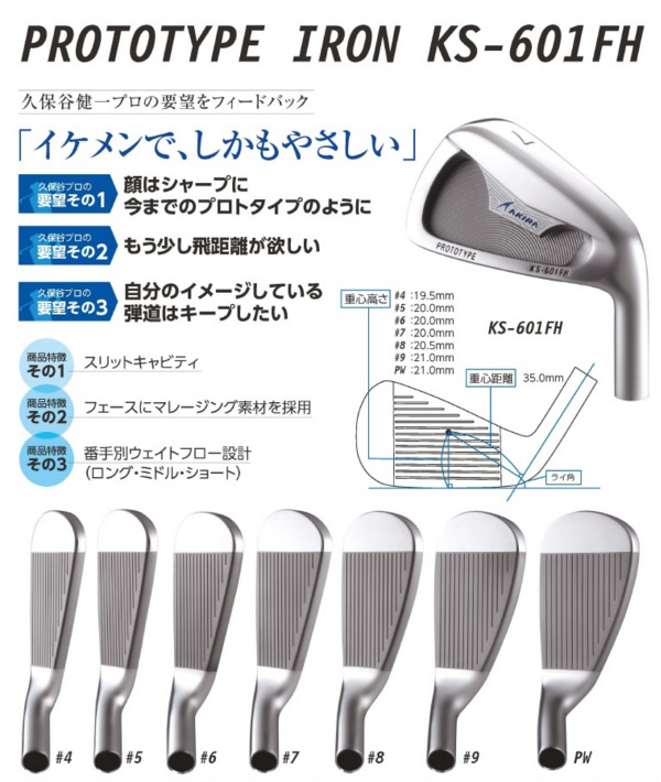 アキラプロダクツ PROTOTYPE KS-601FH アイアンの特徴・飛び系マレージングフェースでありながら、飛距離のばらつきを抑えるために敢えてフェース板厚を厚めに設計。・ミスはミスで出て欲しいという久保谷プロの意見を取り入れ、自分の感覚とは異なるショットが出にくいようボックスキャビティ構造は採用せず、スリットキャビティを採用。同時に抜けの良さを感じるソール幅に。 ・マッスルバックタイプに比べて1番手上の飛距離とやさしさを得ることができるモデルでありながらも、イメージ通りの弾道と心地良い打球感を得られる中上級者向けの設計。