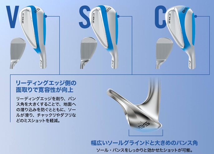 クリーブランド CBZ ウエッジの特徴ゴルフクラブのためだけに独自開発した新素材「Z-ALLOY」。ツアーで存在感を示した合金が、キャビティバックウエッジに搭載。 高い寛容性と心地よい打感、そして、ハイレベルなスピンコントロール性能を実現する。 ショートゲームをやさしくするキャビティバックウエッジ 高いショット安定性Z-ALLOY+ZIPCORE 打点位置に近い重心位置設計により、オフセンターショットでも高い飛距離安定性と方向安定性を実現。 さらに心地よい打感Z-ALLOY+GELBACK TPU ソフトなヘッド素材とさらに増量した衝撃吸収素材により、優れたフィーリングを実現。 優れたスピンコントロール性能HYDRAZIP+ULTIZIP 精密なレーザーミーリングとグルーブ設計により、悪条件下でも優れたスピン性能を発揮。 ![]() やさしく振り抜けるソール設計さまざまなシーンを想定し、あらゆる状況のショットをやさしくするロフト別ソール設計。V-SOLELofts 46° 48° 50° 52° ダフリを恐れず気持ちよくフルショット! V字のソールがフルショットやスクエアフェースのショット時に 抜けの良さを発揮し、チャックリやダフリのミスを軽減。S-SOLELofts 54° 56° バンカーも一発でラクラク脱出! ヒールを削ったワイドなソールがバンカーやラフなど フェースを開いたショットで効果を発揮。C-SOLELofts 58° 目の前のバンカーや池越えも怖くない! ヒール・トウ側を削ることで、あらゆる場面で抜けが良く フワリと上がるショットを実現。振りやすさを追求した重心設計キャビティアイアンとの流れを意識した設計により、違和感のない振りやすさを実現