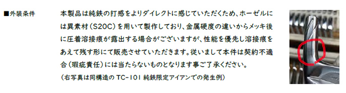 三浦技研 CB-302 99.3 Pure アイアン(限定生産品)の特徴ミウラウェッジの極上打感をアイアンでも、という要望に応える純鉄限定アイアン CB-302 の登場です。鍛造・研磨加工が難しい純度 99.3% 以上の純鉄を三浦技研ならではの熟練の技術力で美しく仕上げたヘッドです。ボールとの接触時間が長く、操作性能やスピン性能に優れた純鉄という素材の特性をいかすことができるヘッドで、他に類を見ない極上打感をぜひ堪能してください。ソリッドな打感を追求し、ホーゼル部には純鉄より硬度の高い S20C 軟鉄を採用。そしてそのホーゼルには純鉄限定モデルを表す Spiral Groove を施しました。 ●限定アイアンに相応しい特別仕様の√Bee MG グリップとソケット、専用ソロカバーを付属。希望装着グリップが異なる場合は、√Bee MG グリップを添付します。 ![]()
